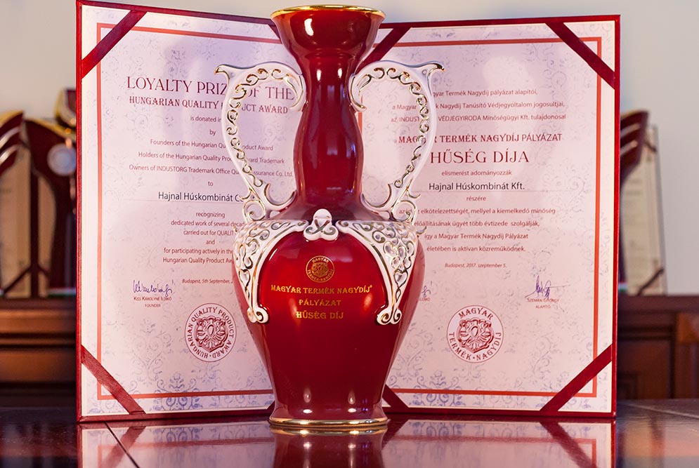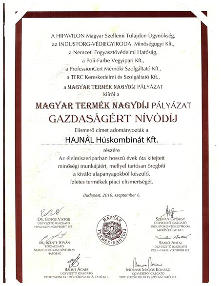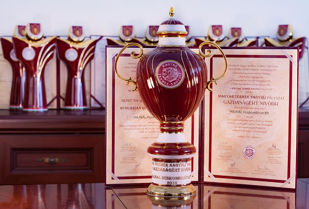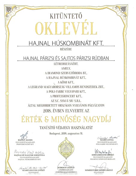 2013 szeptemberében elnyertünk két Magyar Termék Nagydíjat, a Hajnal Párizsi és a Hajnal Dán szalámi termékünkkel. Boltjainkban folyamatosan tájékoztatjuk vevőinket minőségi termékeinkről és elnyert díjazásunkról.