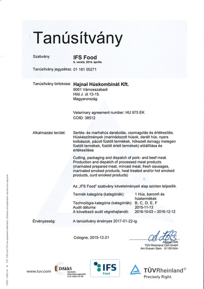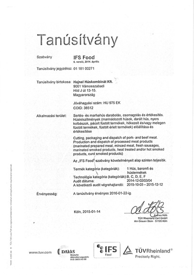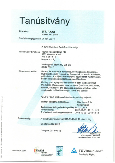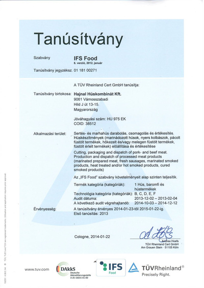 Üzemünk 2009 óta HACCP élelmiszer biztonsági rendszer szerint működik. A később tanúsított IFS FOOD / regisztrációs szám 01 181 00271/ a termék biztonság és a visszaazonosítás legérzékenyebb biztonsági rendszere